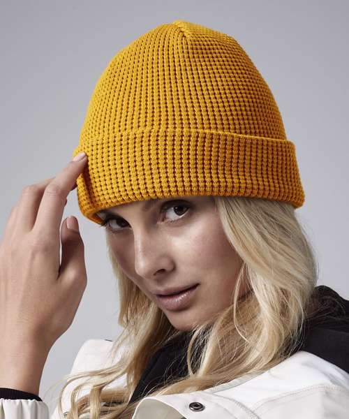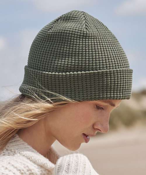 With its tactile waffle knit texture, the BC52N Organic cotton waffle beanie is soft, comfortable, and skin-friendly. The cosy, double-layered design features an easy-to-decorate turn-up cuff and a snug unisex fit. The natural and breathable qualities of the 100% certified organic cotton make this beanie perfect for milder days, meaning this ethically-made, sustainable style can be worn all-year round.
