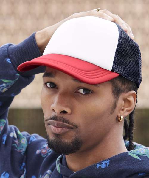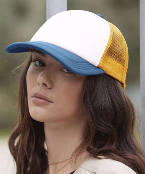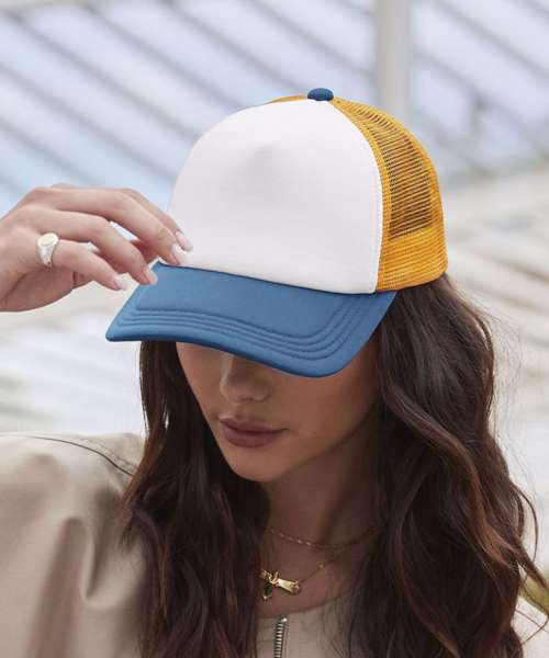 The Retro 5-panel trucker blends bold, contrast colours with a classic design. Combining comfort and sustainability, the front panel and peak are padded, with recycled polyester mesh rear panels. The 5-panel design and cotton-lined front panels ensure a comfortable fit, while the snapback adjuster provides easy wearability.