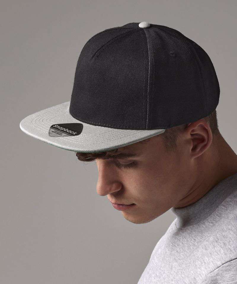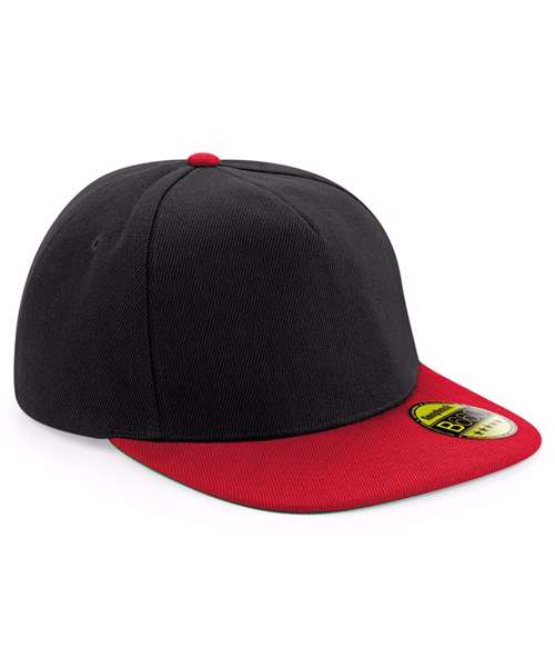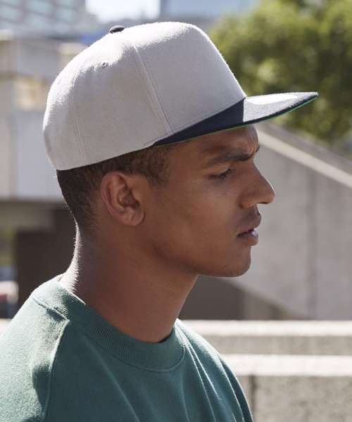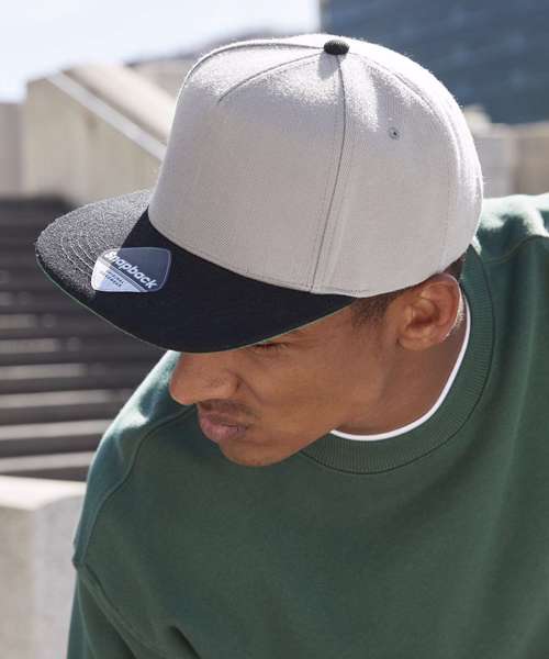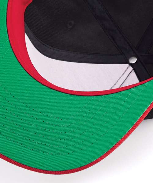 Flat peak. Green underpeak. Retro style snapback size adjuster. Authentic peak sticker. Stitched ventilation eyelets.