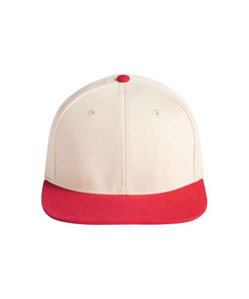 Contrast detailing. High-profile 6-panel design. Semi-structured front panels. Flat peak. Stitched ventilation eyelets. Retro-style snapback size adjuster. Tear-Away label for easy rebranding.