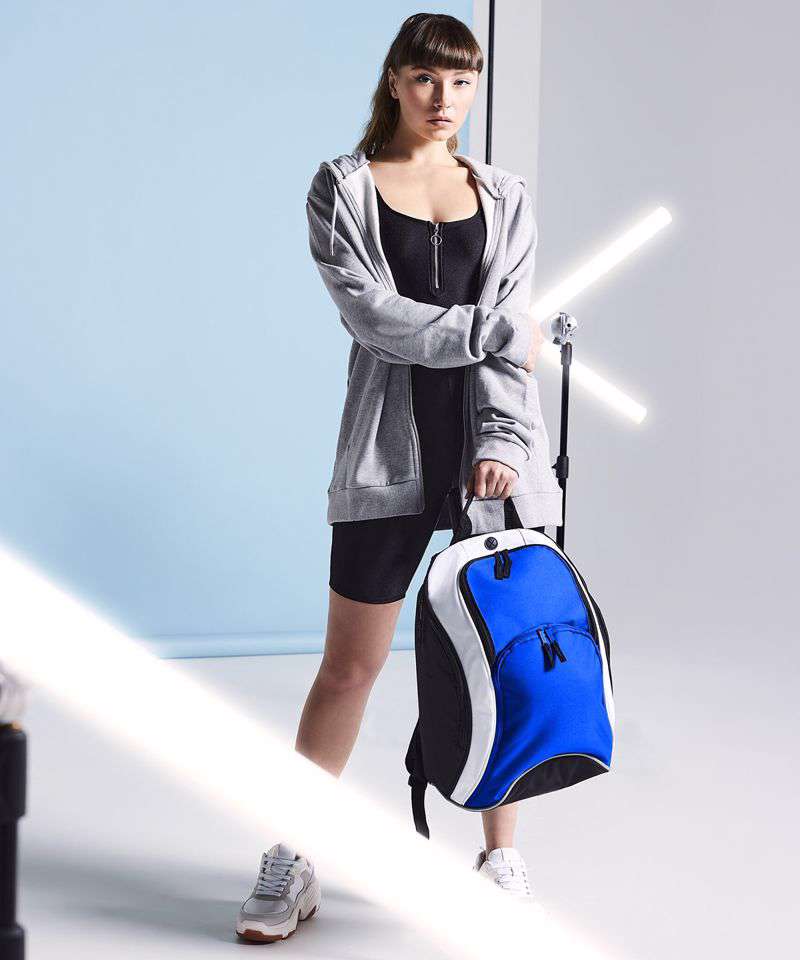 - Padded adjustable shoulder strapsMedia pocket and headphone portWater bottle pocket