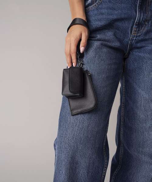 Saffiano fine grain. Three-piece product. Air pod case with a press-stud opening. Webbing wristlet strap. Zipped card wallet. High-shine gold metal trims. Compatible with bags and accessories from the Boutique Collection. TearAway label for ease of rebranding.