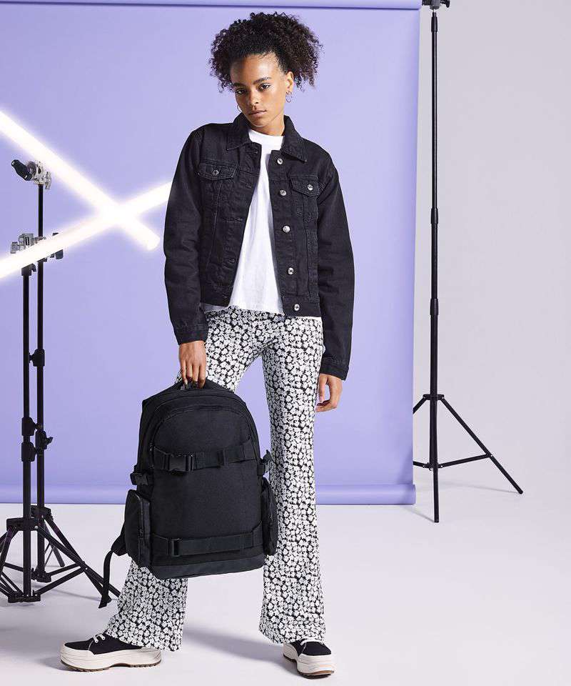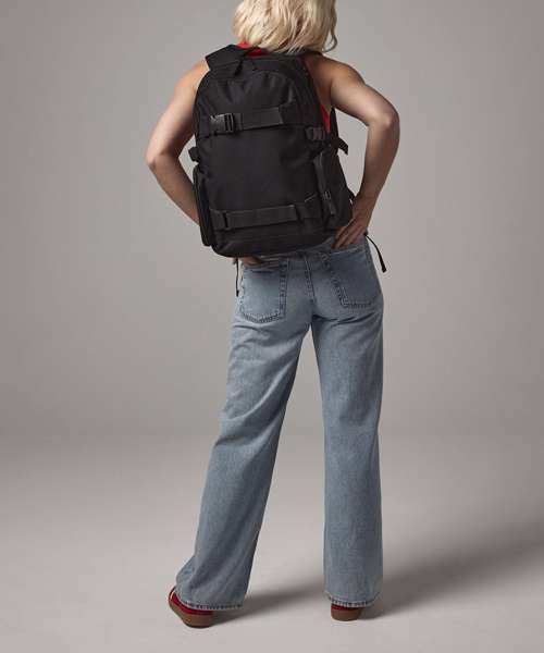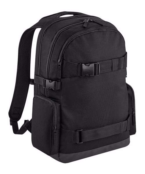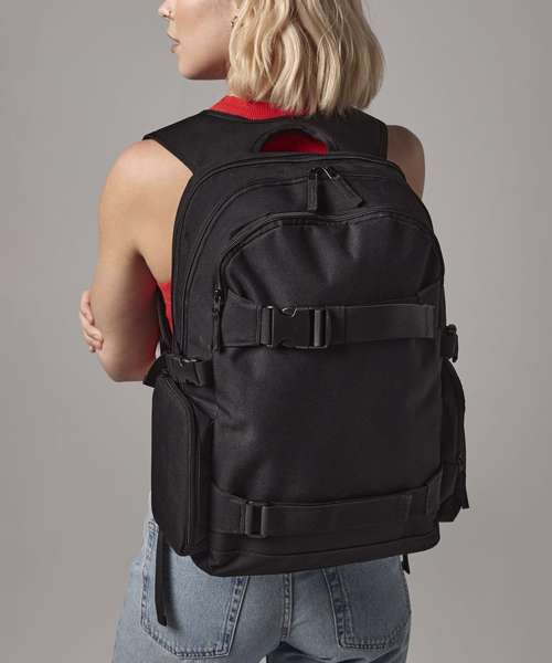 TearAway label for ease of rebranding. Laptop compatible up to 17". External access padded laptop compartment. Skateboard carry straps. Internal organiser section. Zippered front pocket. Zippered side pockets. Padded back panel. Compression straps. Padded adjustable shoulder straps. Grab handle.