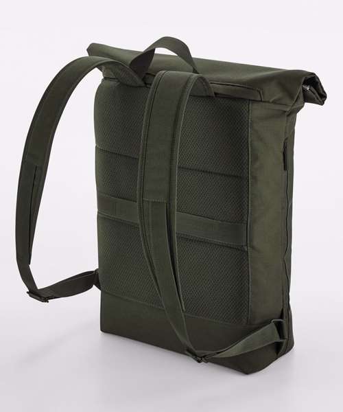 Contains 100% certified recycled polyester. Water-repellent fabric. Minimalist styling. Magnetic roll-top closure. Padded laptop compartment, compatible up to 15.6". External pocket for easy access to internal laptop compartment. Zipped side pocket for bottle/umbrella. Exterior zipped front pocket for easy decoration. Internal slip pocket. Padded air mesh back panel. PU, self-coloured zip pulls. Rear luggage strap. Padded, adjustable mesh shoulder straps. TearAway label for ease of rebranding.