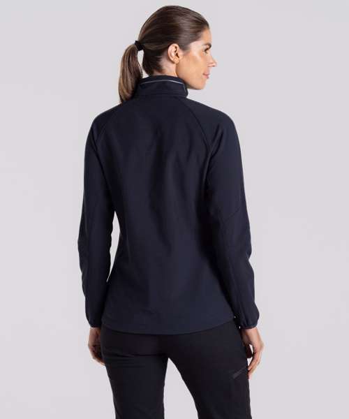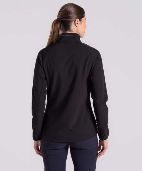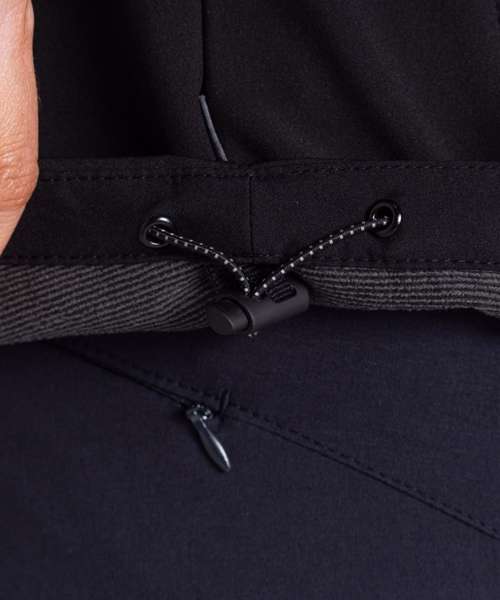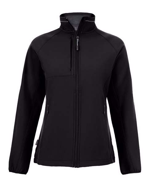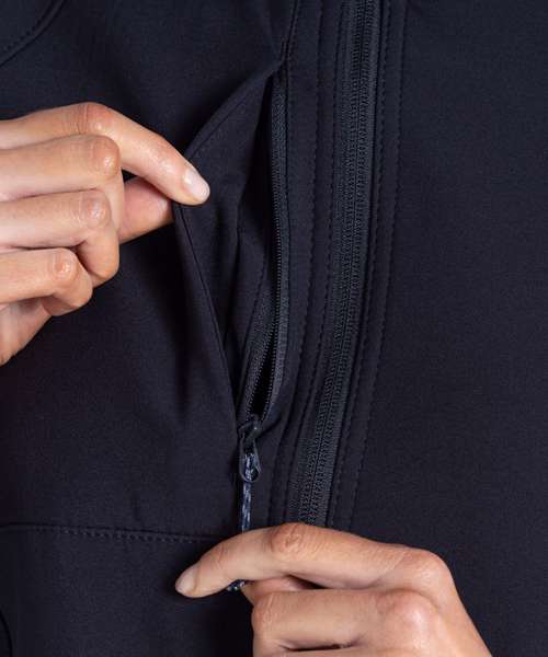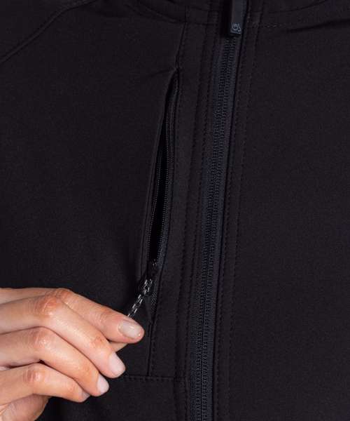 Water-resistant and windproof softshell jacket with 3 pockets. Recycled polyester elastane softshell with EcoShield DWR finish. Striped microfleece back and recycled zip tapes.