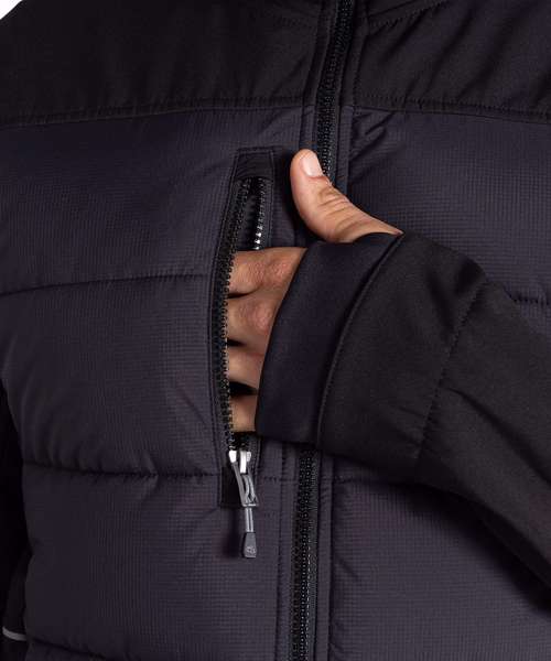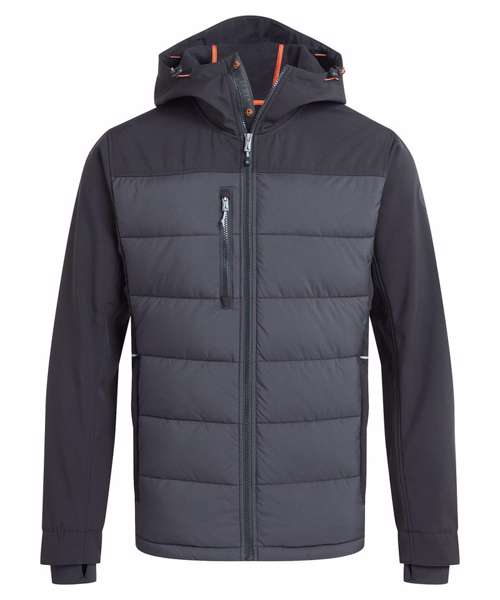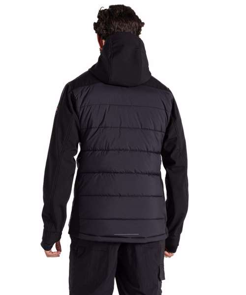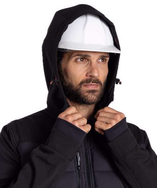 Designed to deliver effortless warmth in cooler conditions, this durable hooded jacket is a great workwear staple. Its stretch softshell construction features a snug microfleece back with baffled body panels for extra core insulation. The H2OShield DWR finish helps to shrug off showers, while odour-control panels help keep you fresh.