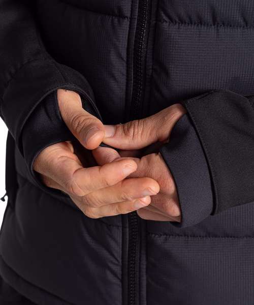 Upper body & hood: 97% Polyester (62% recycled), 6% elastane. Lower body outer: 100% Polyester (50% recycled). Lower body lining & fill: 100% Recycled polyester
