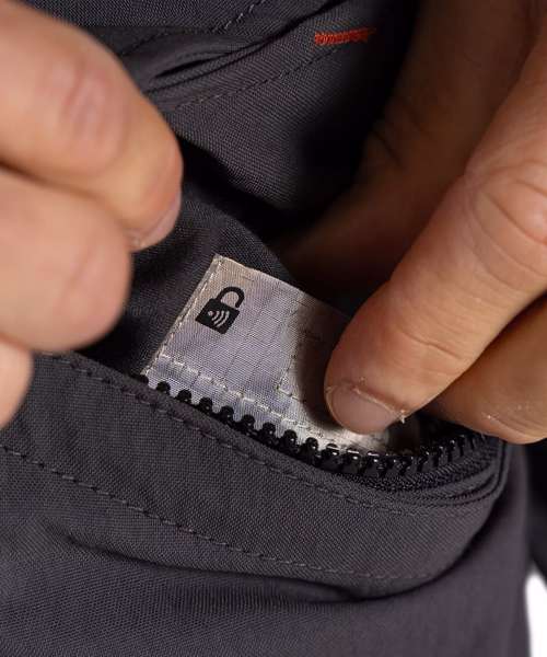 Part-recycled polyamide elastane with H2OShield DWR finish, polyamide Cordura® panels and part-recycled zip tapes. ETI factories, REACH compliant.