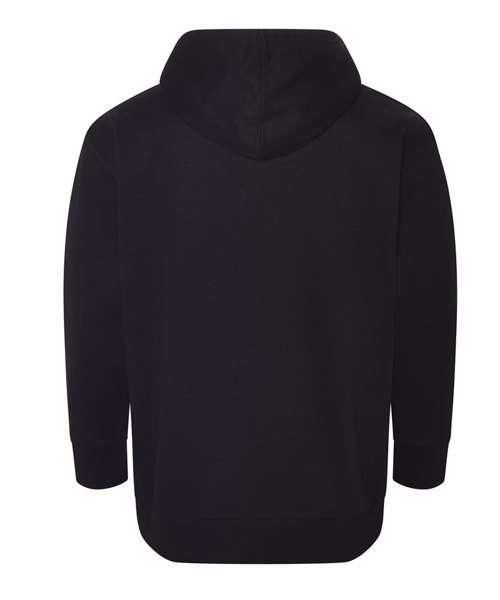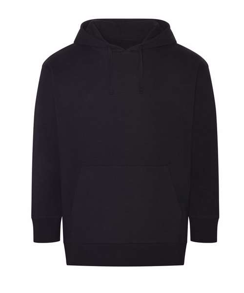 Relaxed unisex fit. Kangaroo pouch pocket. 2x1 ribbed cuff and hem. Peached face. Brushed inner fleece. Size tab only, for easy rebranding. DTM drawcords.