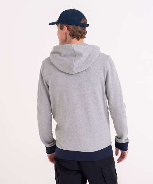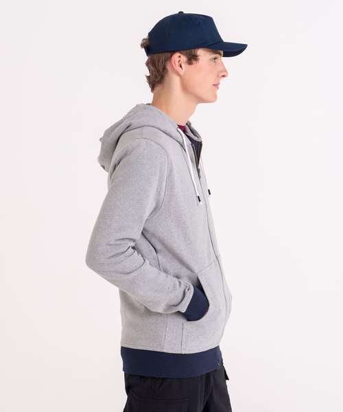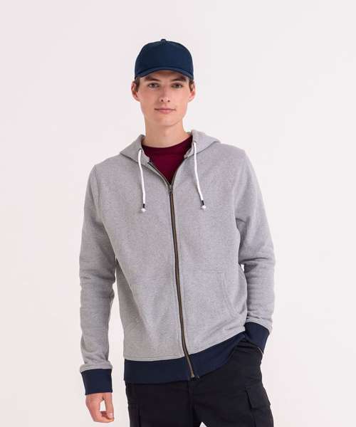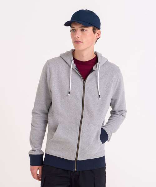 Long sleeve regenerated cotton zoodie with brushed inner and peached outer face. Features include set-in sleeves, contrast rib at cuffs hem, full length front zip and kangaroo pocket.