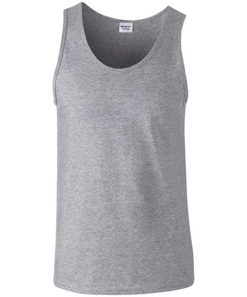 Wide straps. Rib knit trim applied to neckline and armholes. Twin needle bottom hem. Quarter-turned to eliminate centre crease. Tearaway label.