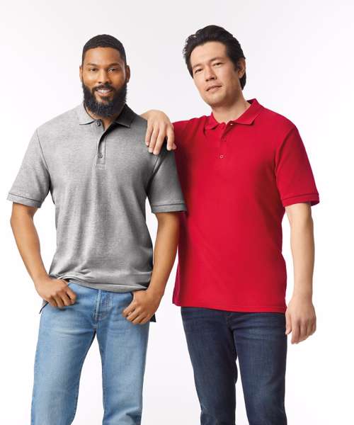 Combed Ringspun cotton double piqué knit. Side seamed with side vents. Contoured welt collar and cuffs. Tearaway label. Rolled forward topstitched shoulder. Clean finished placket with reinforced bottom box. 3 colour-matched buttons. Twin needle bottom hem.