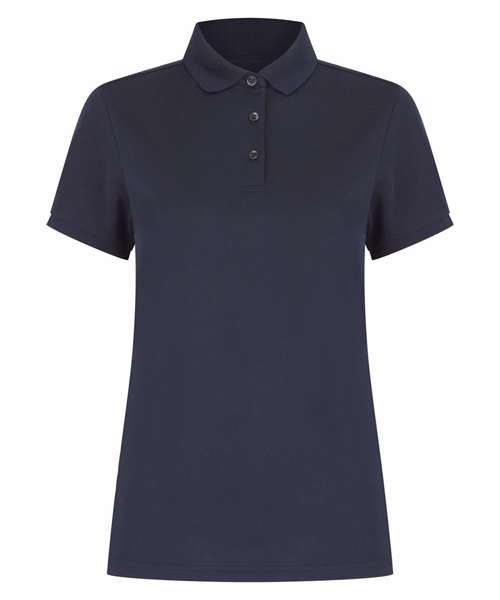 Polo shirt made from recycled polyester yarn with wicking properties. Regular fit with three-button placket. Henbury stand-up collar. 1x1 ribbed collar and cuffs. Dyed-to-match buttons. Female fit with shaped side seams. Henbury cut-out label for easy rebranding.
