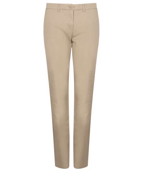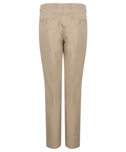 Women's slim fitting chino with added stretch for comfort and ease of movement. Includes YKK front zipper, belt loops, slanted side pockets, two single jet back pockets, back darts for added fit and DTM buttons.