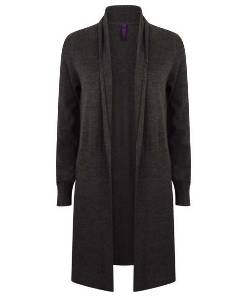 Fine knit, 12 gauge women's long line loose cardigan. Half ribbing detail on body and sleeves. Semi-fashioned sleeve. Henbury cut-out brand label. Co-ordinates with HB720 product range.