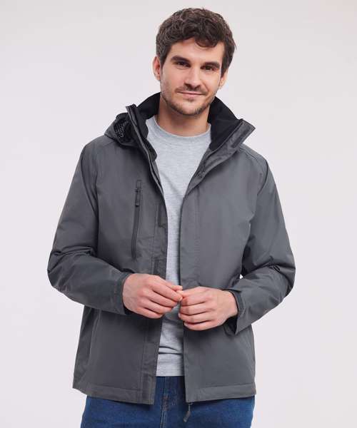 Water resistant garment. PU coated with critically taped seams, fabric is waterproof to 2000mm and breathable: 2000gsm per 24 hours. Active fit: articulated elbows, raglan sleeves and concealed hood. Advanced features include; zipped handwarmer pockets with internal pocket for phone/MP3, storm flap with rain channel, reversed zips and soft touch inner collar. Concealed 3 piece hood, fully lined with discreet concealed decoration access at hem.