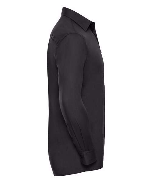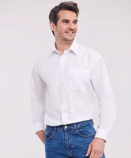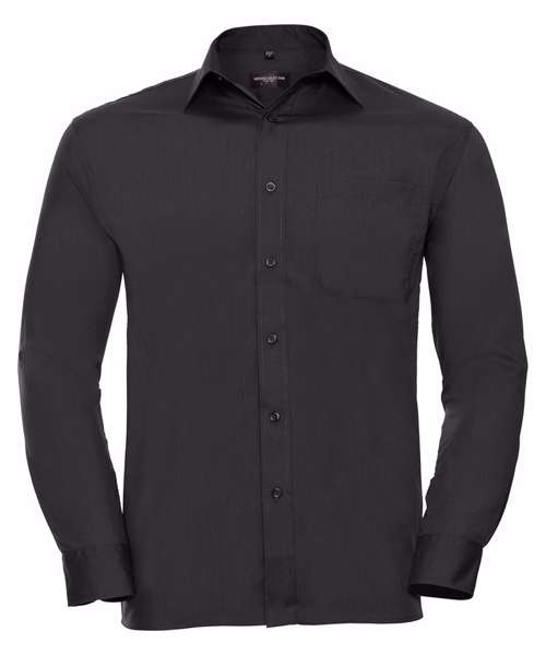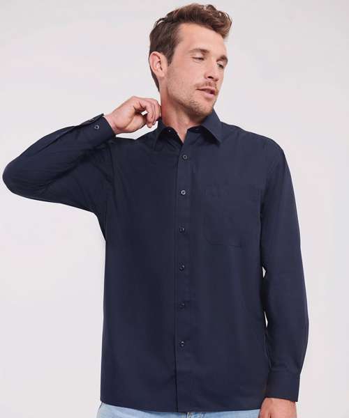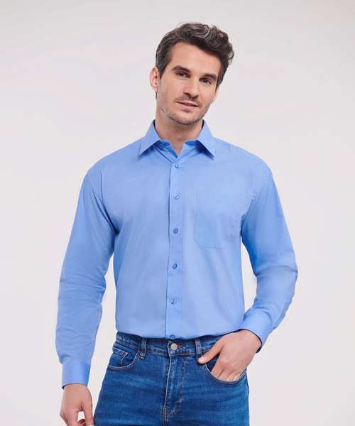 Smart and stylish shirt design in a fine poplin fabric. Classic style boned collar. Rounded 2 button adjustable cuff plus single button on cuff gauntlet. Back yoke with 2 side pleats. Pocket over left chest mitred edge. Straight bottom hem. The elegant lightweight fabric is especially suited to finer embroideries.