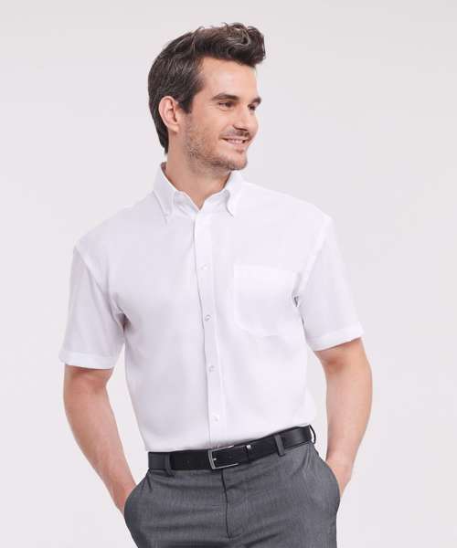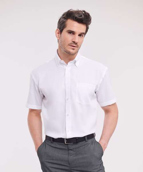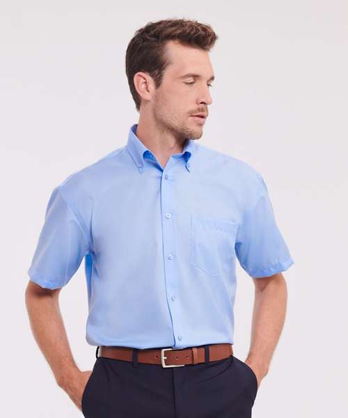 Made using the newest technologies of non-iron fabric that stays wrinkle free and keeps the wearer looking and feeling smart all day long. The classic gents shirt cut with semi-cut away button down collar and chest pocket. Back yoke with two pleats. Rounded hem.