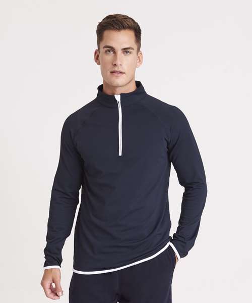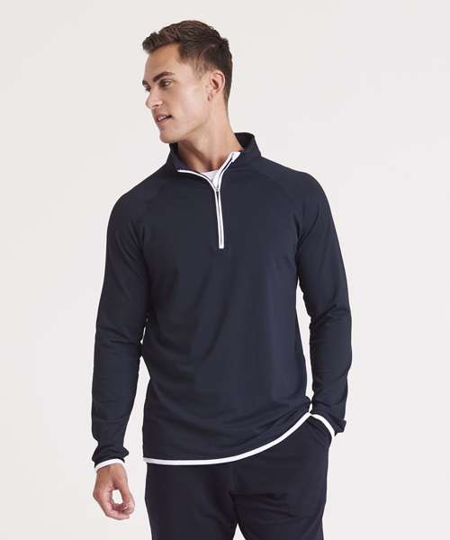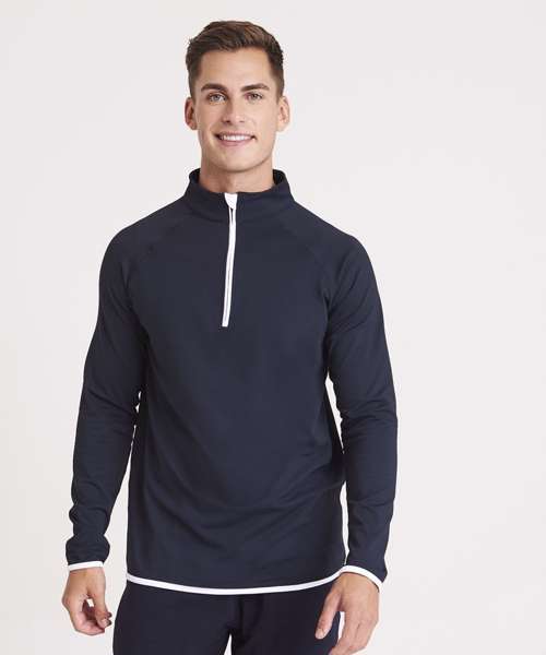 Stay warm and comfortable in this CoolFit ½ zip sweat which is ideal for layering. A tight fit with self-fabric, contrast colour binding at the zip, cuffs and hem. The raglan sleeves create ease of movement and there’s even a reflective tab on the back neck to help keep ear phone cords in place so you can listen to your favourite playlist to keep you motivated.