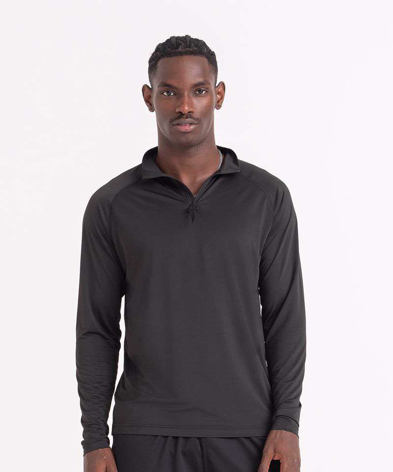 Raglan sleeves. Performance fabric. YKK 1/4-zip. Standard fit. Tear-away label. Quick-dry wicking fabric. Contains recycled polyester.