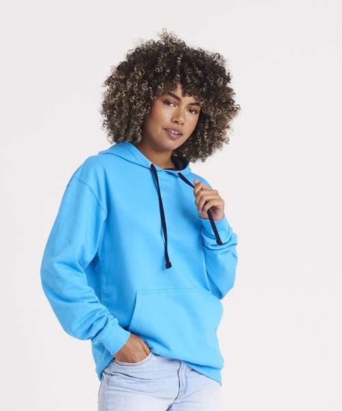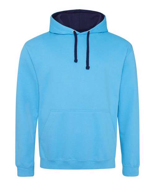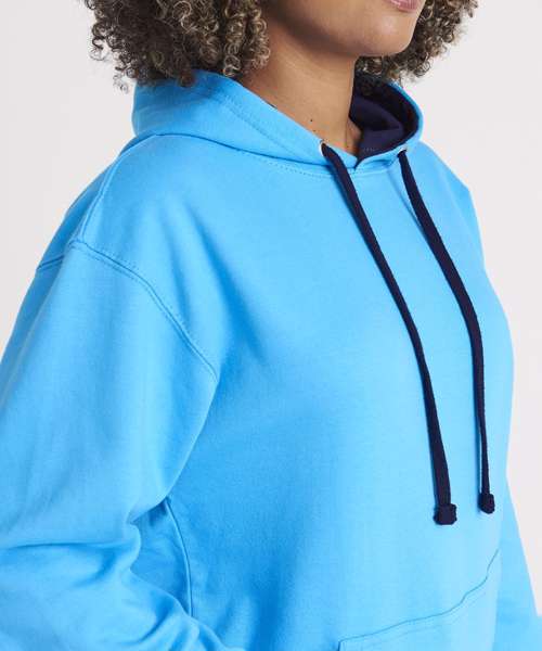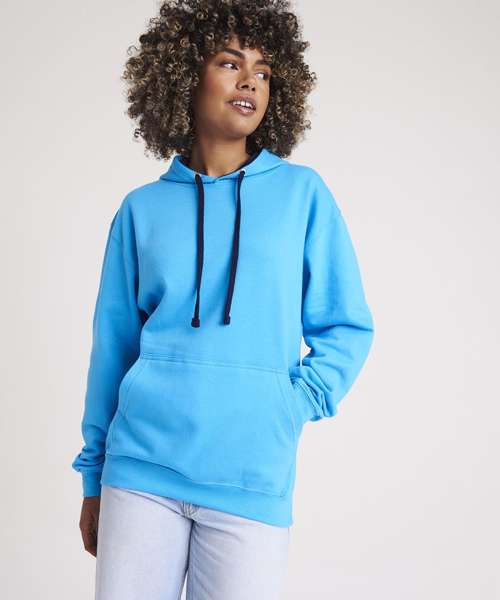 Twin needle stitching detailing, double fabric hood with contrast inner, contrast flat lace drawcords. Kangaroo pouch pocket. Ribbed cuff and hem. Soft cotton faced fabric creates ideal printing surface. Simple tear out label makes it perfect for rebranding. Brushed inner fabric.