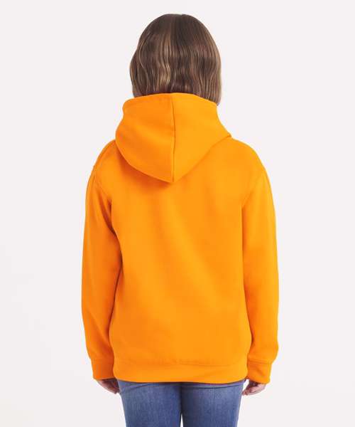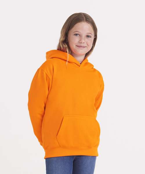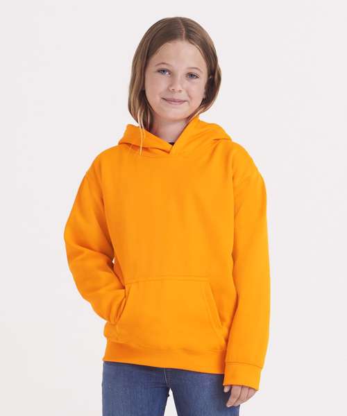 Vibrant eye-catching colours. No drawcord to comply with EU regulation. Twin needle stitching detail. Kangaroo pouch pocket. Ribbed cuff and hem. Simple tear-out label. Brushed inner fleece.
