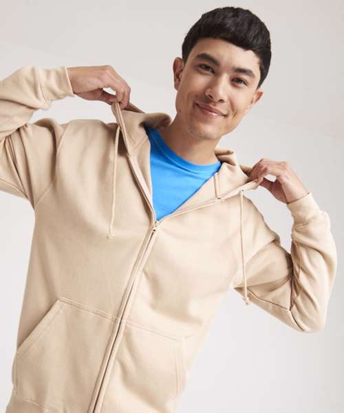 Full zip hoodie with a covered main zip with self fabric. Twin needle stitching detailing and double fabric hood with self coloured cords and kangaroo pouch pocket. Ribbed cuff and hem and self coloured twill tape puller. Soft cotton faced fabric creates ideal printing surface. Simple tear out label makes it perferct for rebranding. Brushed inner fleece.