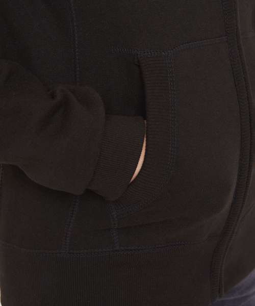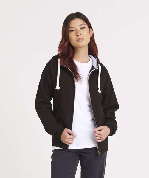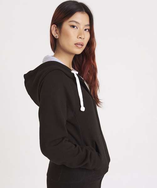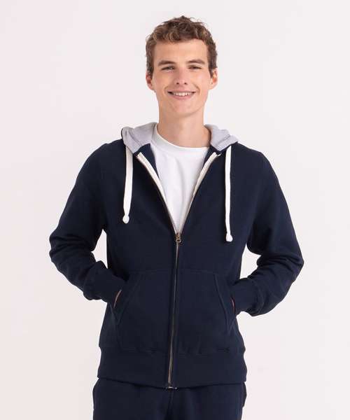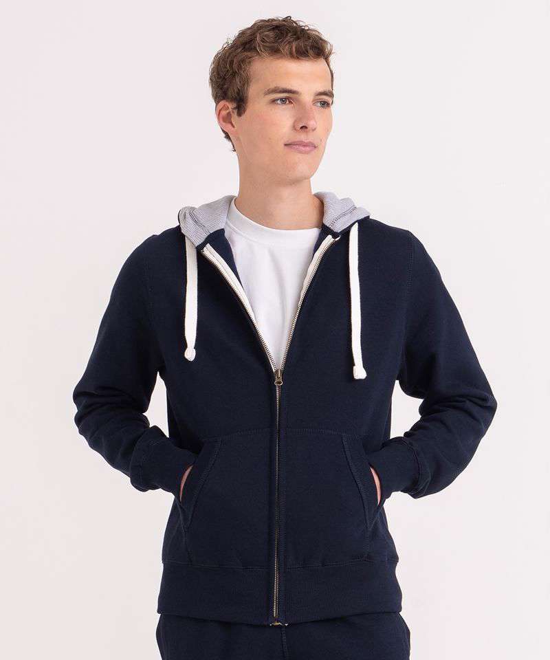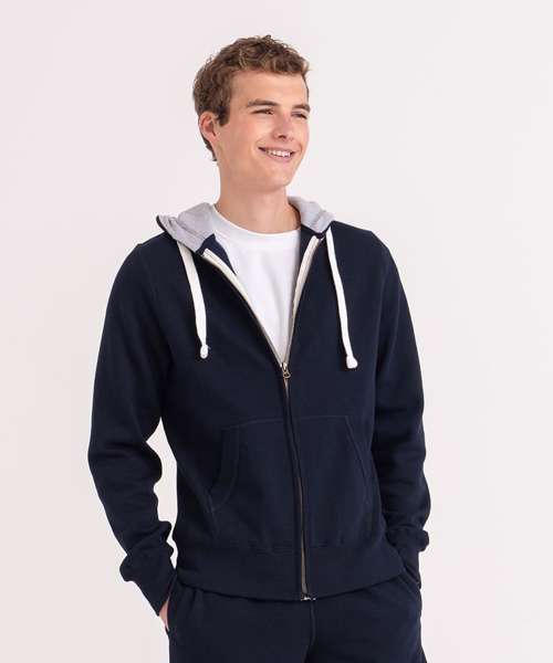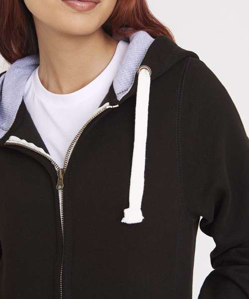 Full zip hoodie. Side panels for stylish fit. Brass zip covered with chunky rib detail. Overlock stitching detail throughout. Double fabric hood with heather grey waffle fabric inner. Chunky white flat lace drawcord. Kangaroo pouch pocket. Deep ribbed cuff and hem. Soft cotton faced fabric creates ideal printing surface.
