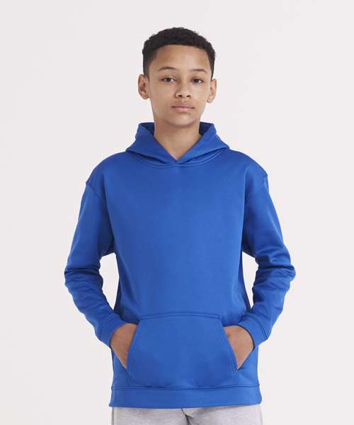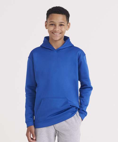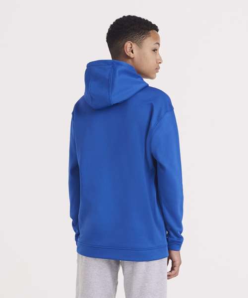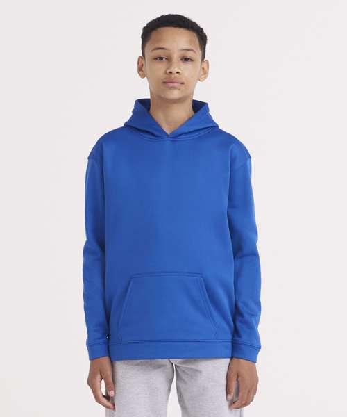 A warm and comfortable classic hoodie for kids. Featuring brushed back polyester, set-in sleeves and double fabric hood. Pair with jeans or joggers for a casual sporty look.