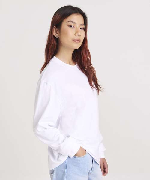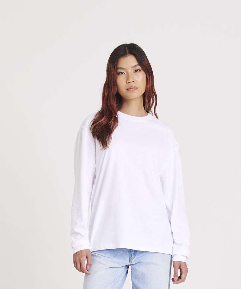 Oversized fit. Side seams. Long sleeves with cuffs. Ribbed crew neck style with taped neck. Set-in sleeve. Size label only, for easy rebranding – colour-coded black for unisex. Combed ringspun cotton for ultra-comfort. Excellent surface for print or embroidery. Twin-needle stitching detail.