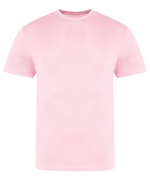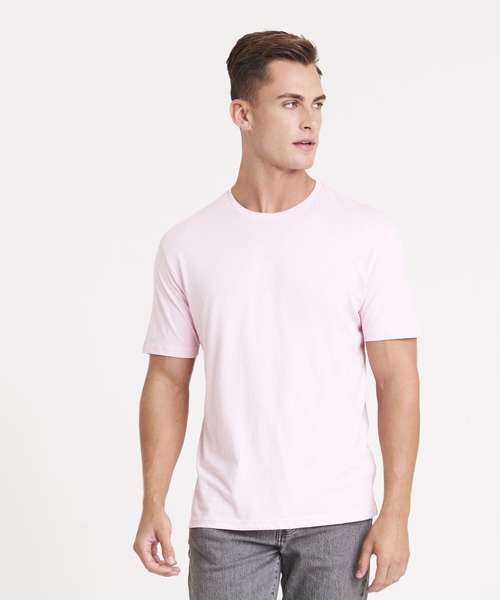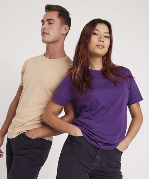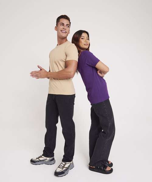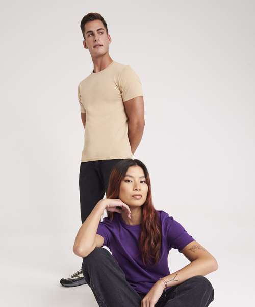 Modern fit. Short sleeves. Side seams. Taped neck. Ribbed crew neck. Twin-needle stitching detail on sleeve and bottom hem. Size label only for easy rebranding - colour coded black for unisex.