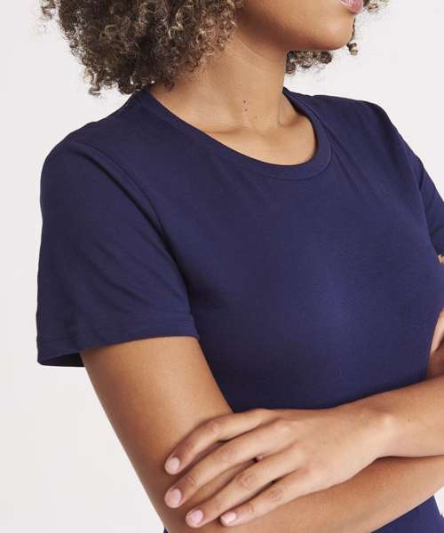 Modern girlie fit. Short sleeves. Side seams. Taped neck. Ribbed crew neck. Twin-needle stitching detail on sleeve and bottom hem. Size label only for easy rebranding - colour coded white for ladies.