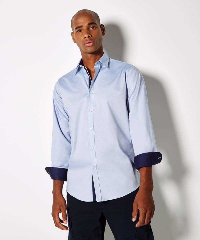 Fused stand-up button-down collar with contrast inner collar stand. Contrast binding down the centre of button placket. Rounded hem. Double-stitched side and sleeve seams. Single-stitched yoke and armholes. One-button adjustable cuff (with option for cufflinks) with buttoned cuff placket. Spare buttons. Kustom Kit® woven back neck label.