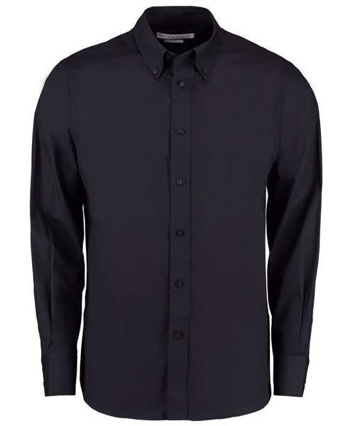 Fused stand-up button-down collar. Single needle stitched yoke and armholes. Double-stitched sleeve and side seams. Two-button cuff with no button pointed cuff placket. Back yoke. Rounded hem. Spare buttons. Kustom Kit® woven back neck label.