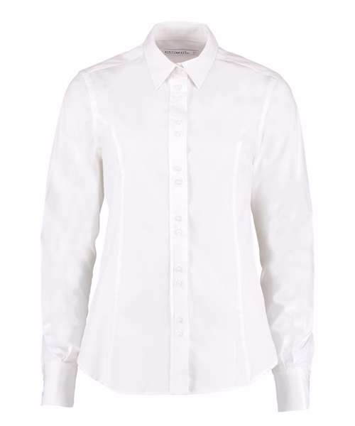 Soft fused interlined stand-up collar. Front placket with thirteen buttons applied in pairs down the placket. Two-button cuff with no button pointed placket. Two curved front panels and two curved back panels. Single needle stitching across shoulders, back yoke and armholes. Double-stitched sleeve and side seams. Rounded hem. Back yoke. Spare button. Kustom Kit® woven back neck label.