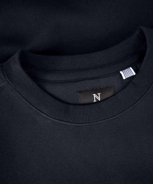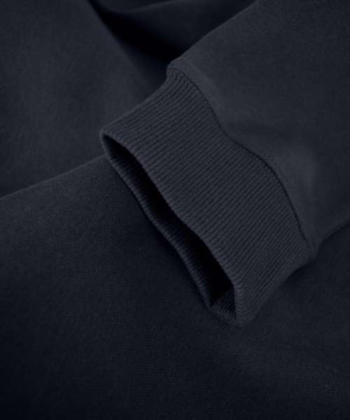 DETAILS: Combed long-staple organic cotton. Brushed fleece lining with short-shave treatment. Forwarded shoulder seems. Ribbed collar, hem and sleeves. Organic cotton. Recycled polyester.