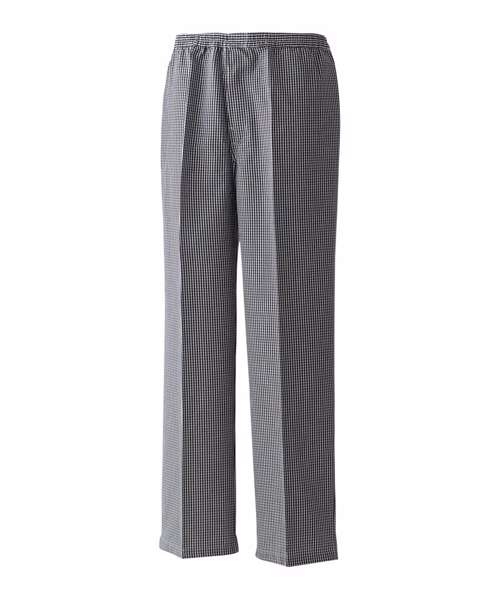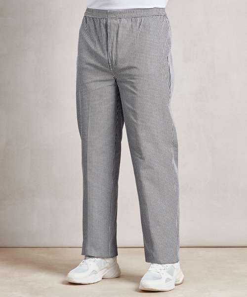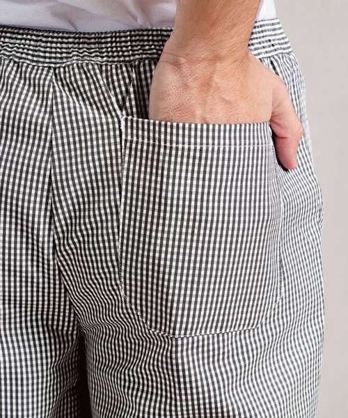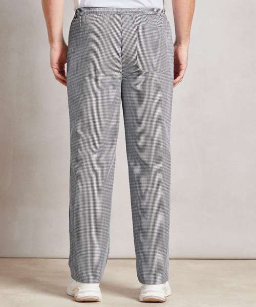 A traditional chef's trouser available in two popular mini-check colourways. An easy-wearing comfortable pull-on style for maximum comfort during long shifts in the kitchen. With an elasticated waist and zip fly and a useful rear patch pocket.
