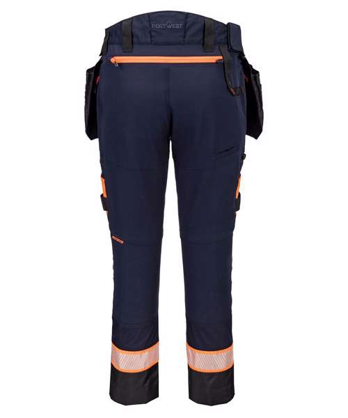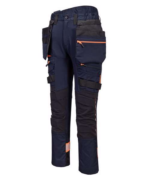 DX4 Detachable holster pocket trousers are ergonomically designed and use the targeted placement of dynamic 4X stretch fabrics to provide maximum range of movement when working. They feature a high-rise back waistband with side elastication, ensuring protection in all working positions, as well as pre-bent, top-loading, adjustable kneepad pockets. Generously-sized front pockets and multifunctional zip thigh pockets offer secure storage of phone, pens and tools. They’re triple-stitched throughout, for maximum durability.