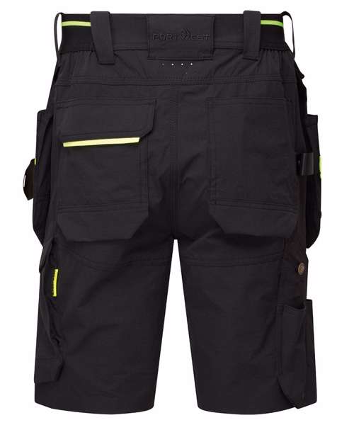 EV4 Lightweight detachable holster shorts are cleverly designed and use the targeted placement of laser holes and stretch fabric to provide maximum range of movement when working. They feature a high-rise back waistband and side elastication, ensuring protection in all working positions. Triple stitching throughout ensures maximum durability.
