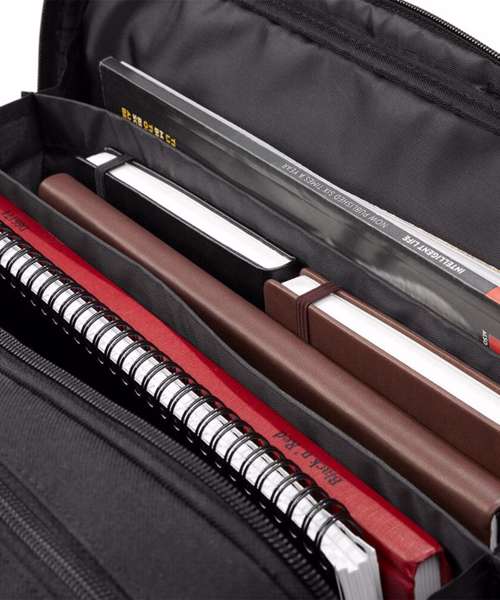 Triple compartment design. Laptop compatible up to 17". Padded laptop compartment. Document section. Detachable adjustable shoulder strap with pad. Zippered front pocket. Organiser section. USB memory stick loops. Wheelie bag strap. Padded handle. iPad mini/Tablet compatible.