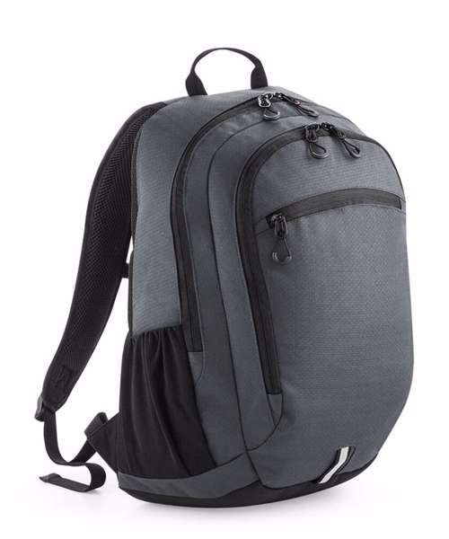 TearAway label for ease of rebranding. Laptop compatible up to 15.6". Dual compartment design. Padded laptop compartment. Reflective accents. Two mesh pockets/ water bottle holders. Zippered front pocket. Internal mesh pocket. Ergonomic padded back panel. Padded adjustable mesh shoulder straps. Adjustable chest straps. Grab handle. Reach certified.