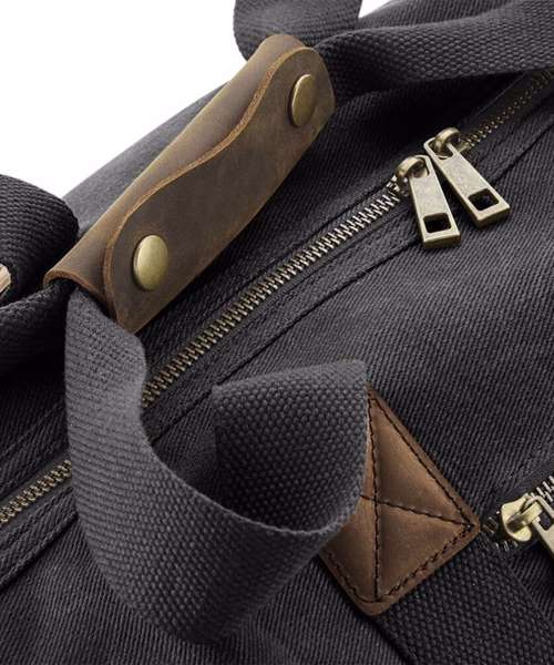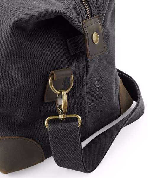 TearAway label for ease of rebranding. Genuine leather accents. Extra long main compartment zip for easy access. Snap fastening fold down ends. Cotton webbing carry handles. Antique brass effect fittings. Fully lined. Hidden lining zip for easy decoration access. Internal valuables pocket. Detachable adjustable shoulder strap. Can be carried by hand or over the shoulder. BSCI certified. Reach certified.