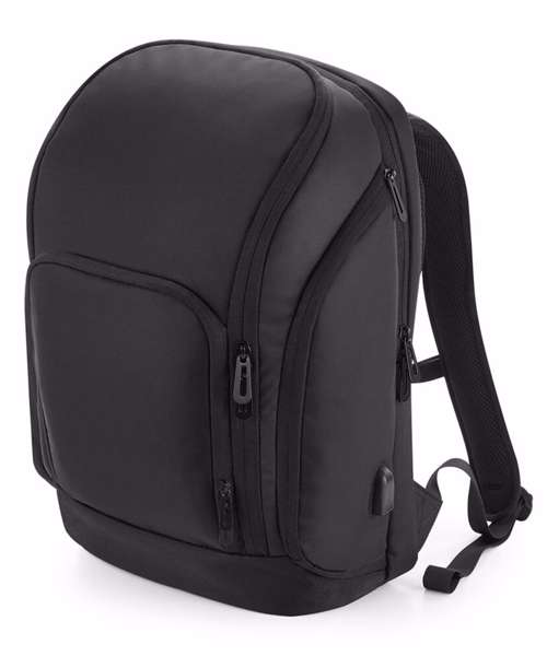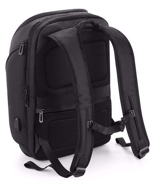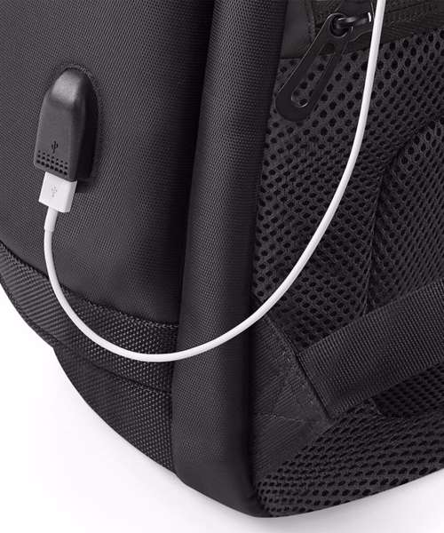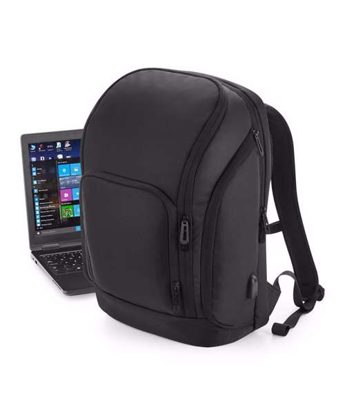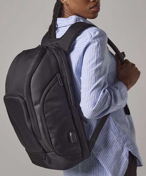 TearAway label for ease of rebranding. Laptop compatible up to 17". External access padded laptop compartment. Padded internal iPad / Tablet compartment. Discrete zippered back panel pocket. Front pocket organiser section. Power bank pocket. Integrated USB charging port. Elasticated cable organiser. Key hook. Zippered internal valuables pocket. Zippered side bottle pocket. Fully adjustable chest strap. Large capacity. Wheelie bag strap. Ergonomic padded back panel. Padded adjustable shoulder straps.