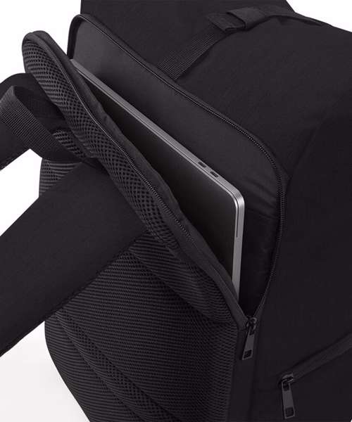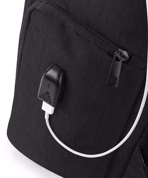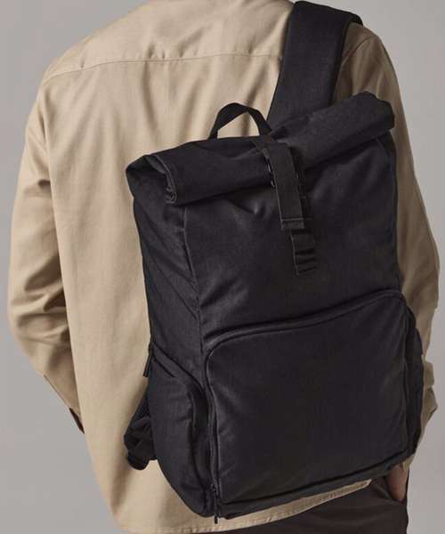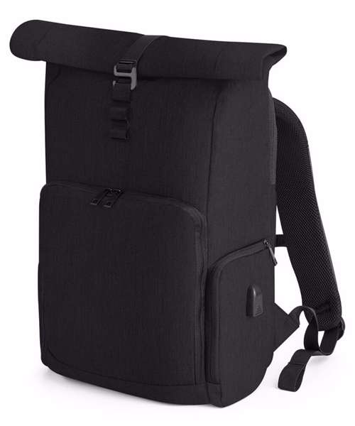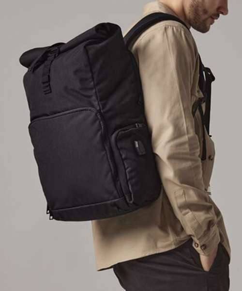 TearAway label for ease of rebranding. Laptop compatible up to 15.6". External access padded laptop compartment. Secure roll-top and clip closure system. Discrete zippered back panel pocket. Front pocket organiser section. Internal slip pocket. Multiple internal pockets. Power bank pocket. Integrated USB charging port. Zippered front pocket. Zippered side bottle pocket. Ergonomic padded back panel. Padded adjustable shoulder straps.