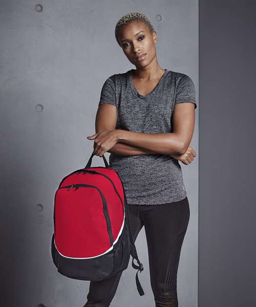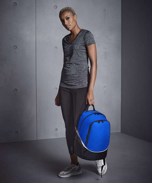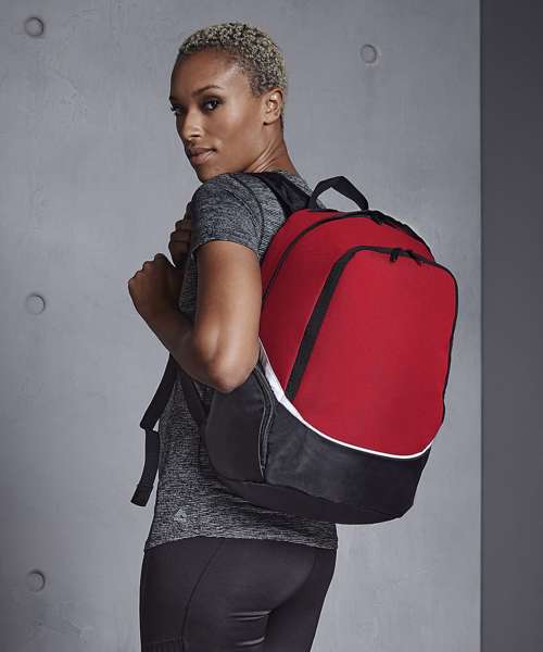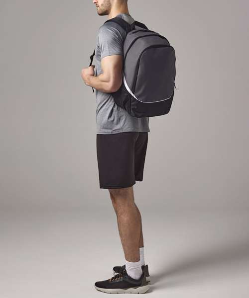 Wet pocket/match ball pocket. Zippered side pocket. Elasticated mesh side pocket. Plush lined media pocket and headphone port. Padded adjustable shoulder straps. Padded back panel. Grab handle.