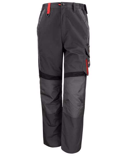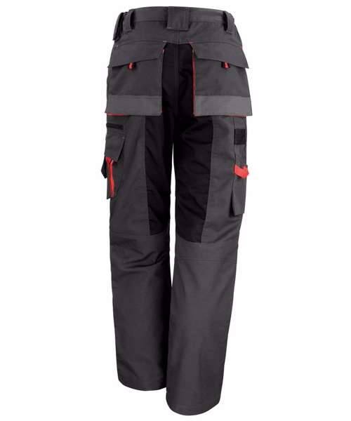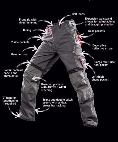 Front zip with rivet fastening. Knee pad pockets. 2 side pockets. Left thigh phone pocket and zip pocket. Cargo multi-use tool pocket. Elasticised waistband. Rear pockets. Belt loops. Reinforced seams with bar tacked pockets and stress points. Triple stitched seams. Decorative reflective stripe. Strengthened contrast knee fabric. Tricot waistband for comfort feel inner. Comfort fit. Highly durable fabric. Expansion waistband allows for adjustable fit and draught protection. Highly technical. Fantastic price point. Black contrast panels and red stitch detailing. 2 trouser turn-up for lengthening if required. Unisex fit. Windproof.Decoration Guidelines:Decorating methods: Embroidery. Decorators access point: Open.