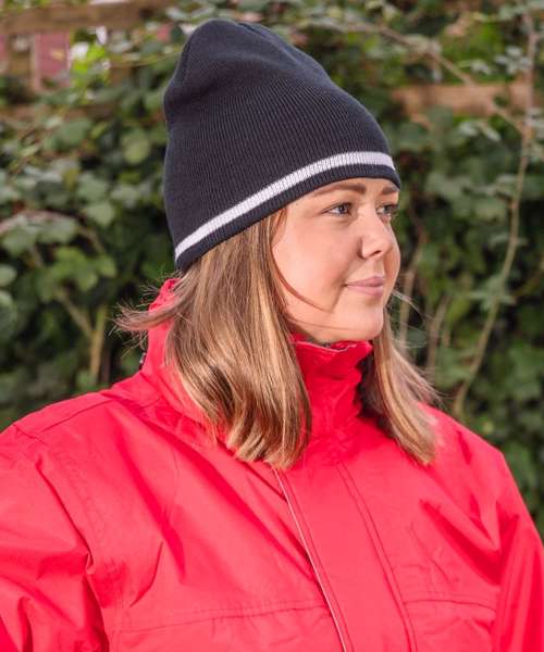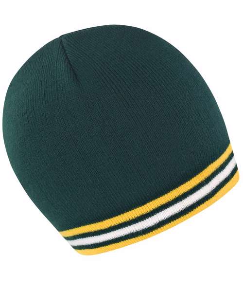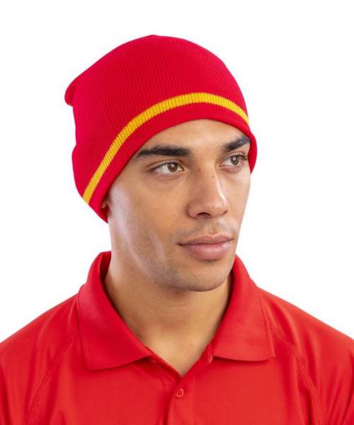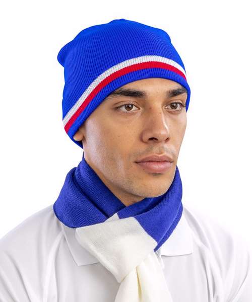 Windproof. 6 gauge dense knit. Stripe knit. Solid colour inner. Cold weather protection. Extremely warm. Stand out national colourways. Team colour trend. Decoration Guidelines: Decorating methods: Embroidery. Decorators access point: Open.