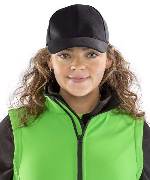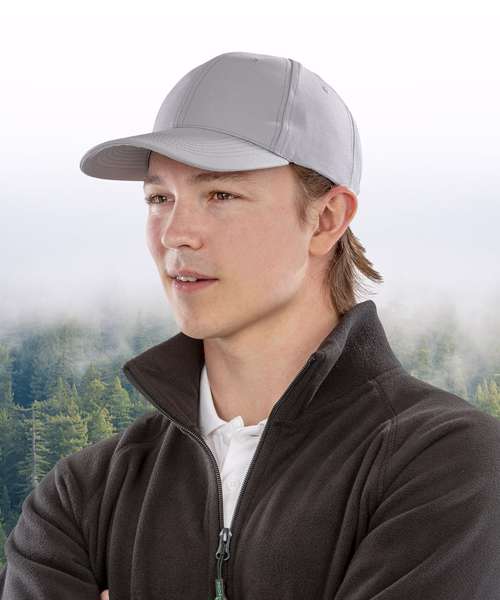 A low-profile baseball design cap using a recycled equivalent fabric to conventional yarns. Ideal for best fit and CORE value budgets.