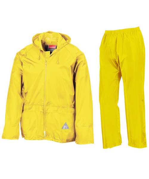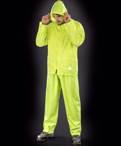 Heavyweight. Taped seams. Hood with tear release. Full front zip fastening. 2 spacious front pockets to jacket and 2 access pockets to trousers. Inner storm cuffs. Mesh ventilated back. Adjustable drawcord hem on jacket. Elasticated waist on trousers. Adjustable snap closing ankles on trousers.Zip closing stuff bag. Reflective triangles. Contains recycled material. Decoration Guidelines:Decorating methods: Direct print & Transfer print Decorators access point: Open.