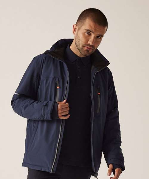 Waterproof and breathable Isotex 10,000 Stretch Ripstop fabric, conforms to EN343 3:2, sealed seams and a DWR (Durable water-repellent) finish for all-weather protection. Thermo-reflect lining panel for heat retention. RFID protection pocket for added security. Thermo-guard insulation on the body and sleeves, and Storm cuffs for added weather protection. Packaway hood that conceals away into collar, 2 zipped lower pockets and 2 zipped waterproof chest pockets. Waterproof centre front zip. Concealed zip in lining for embroidery access, and shock cord adjusters at hem. Reflective details on sleeves and back. .